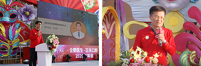 在充满了激情、热烈、活跃的气氛里,企鹅医生正夫口腔集团执行副总张哲人先生与医疗副总张运发先生先后对2019年工作进行总结,对2020年做出新的工作规划;总院长严宁先生发表致辞,以及发表感言,感谢一直以来给予信赖和支持合作伙伴及正夫口腔集团每位员工这一年的辛勤劳作,并表达了对嘉宾朋友和正夫员工的新春祝福。