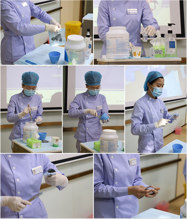 随后,企鹅医生·正夫口腔《2020年护士技能大赛之藻酸盐印模材料调拌技术》正式开始,本次竞赛由自我介绍、操作评比及理论回答三部分组成。